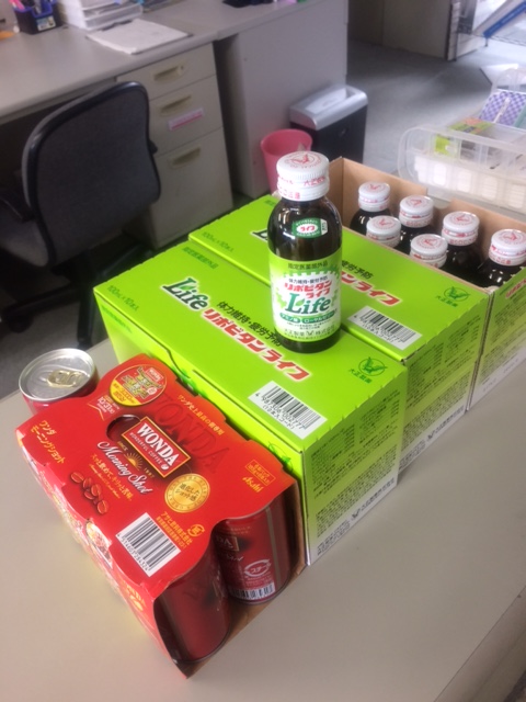 事務所の入口のカウンターの上には栄養ドリンクが3ダースと缶コーヒーが。。お客様からの差し入れかな?それとも社長の奥様からかな?なんて思いながら