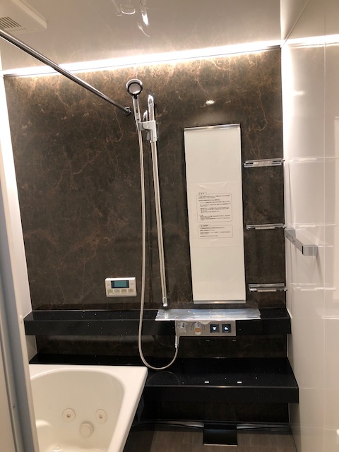 シックで高級感漂うお風呂ですね、間接照明がカッコ良いです。タイルのようにヒヤッとする事も無くなりそうですね。